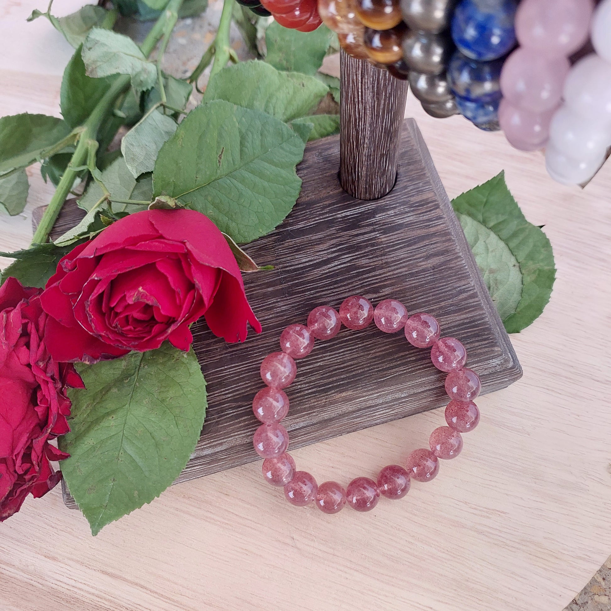 Strawberry Quartz awakens your heart chakra and stabilises your aura. During meditation, you can feel the softness of the Lepidolite within, which naturally soothes and calms your body. The combination of these minerals aids in the alignment of your chakra system. This helps you achieve a healthy inner balance of emotions and learn how to express them effectively. You may seek new outlets as you learn more about yourself and discover hidden passions.