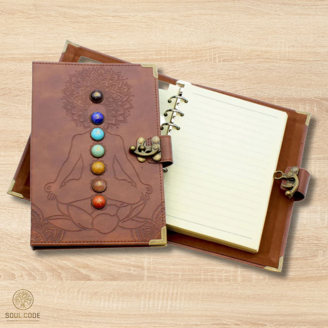 This leather-bound Chakra Journal is a beautiful leather journal etched and inlaid with the seven Chakra stones and symbols. It includes division pages with a description of each Chakra and blank pages for personal notes.