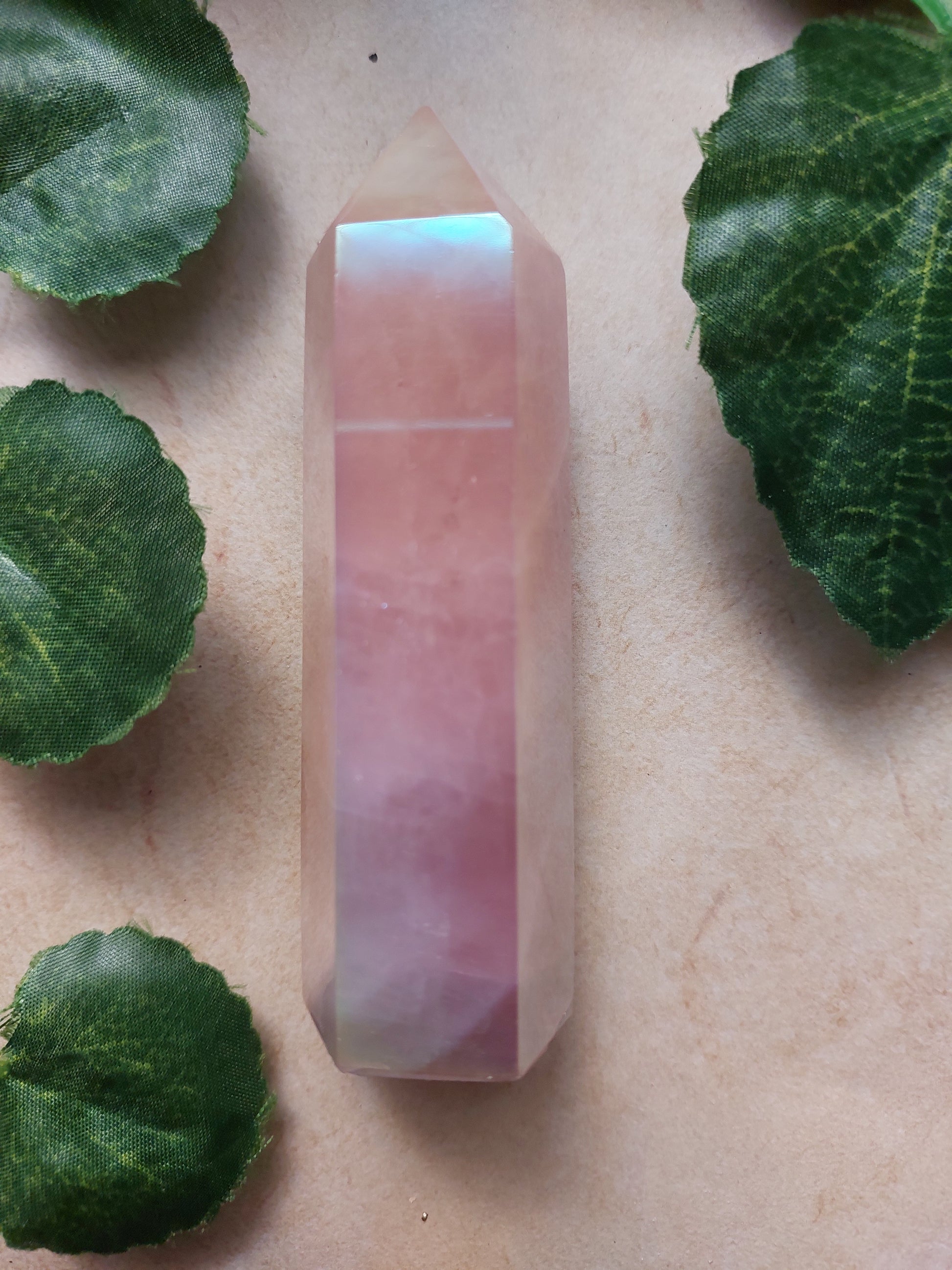 This unique stone is Rose Quartz with an Angel Aura coating. Angel Aura Quartz is an extremely high vibrational stone that’s energies can be felt to the touch. Having been coated in Platinum, Gold, & Silver, this stone is here to transform your life
