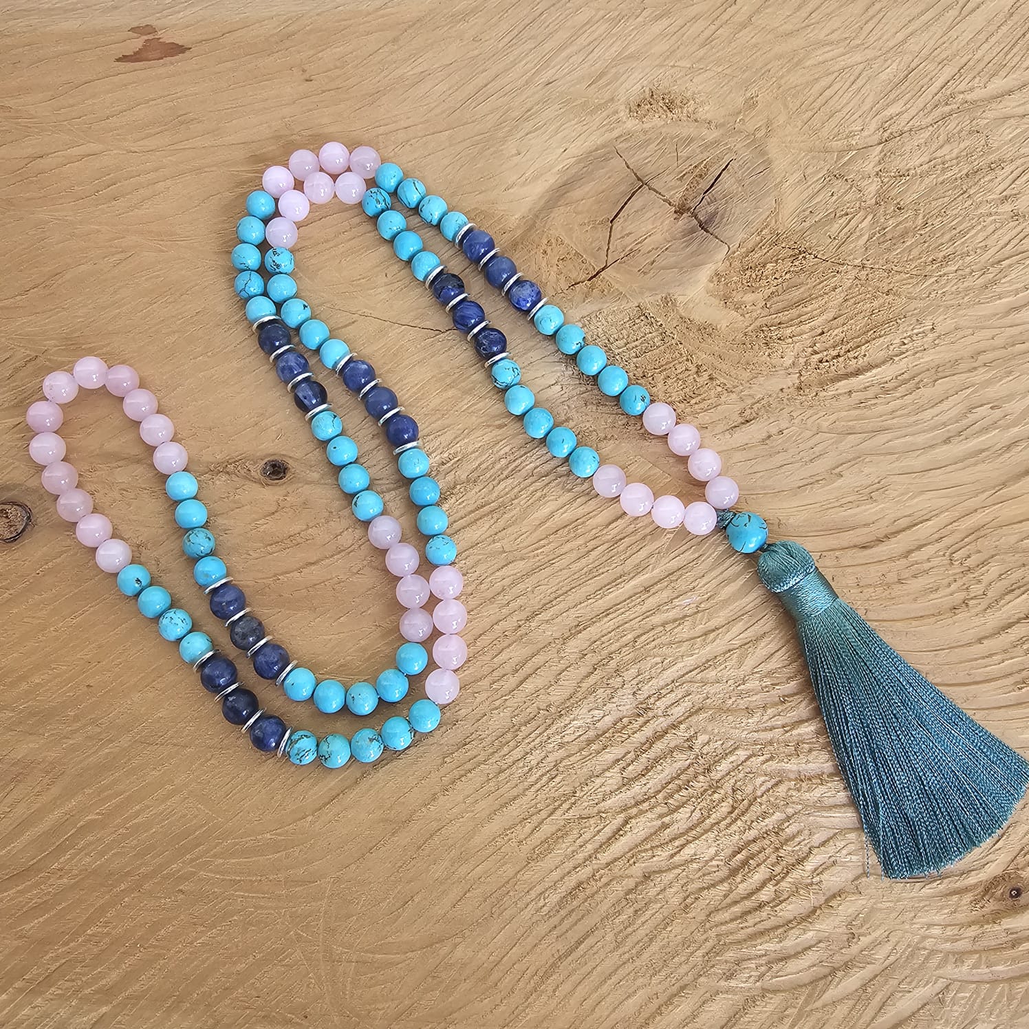Infused with the energies of wisdom, love, and protection, the Sacred Balance Mala blends Turquoise, Rose Quartz, and Lapis Lazuli to bring harmony to mind, heart, and spirit.