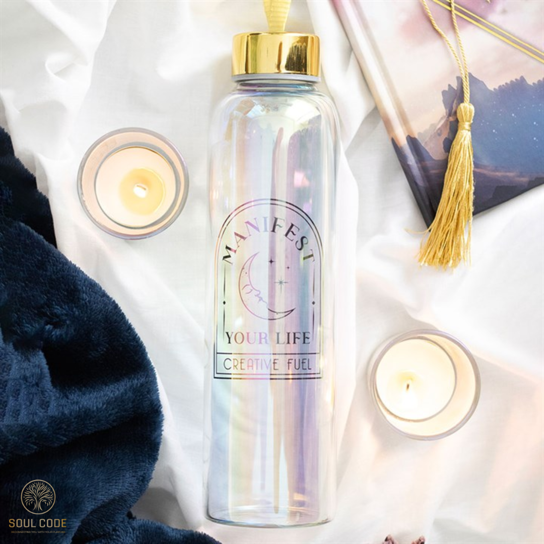 Transform your hydration ritual into a magical experience with this mesmerizing iridescent glass water bottle. The enchanting design shimmers with a mystical glow, while the uplifting words "Manifest Your Life" in elegant gold lettering inspire positivity and empowerment. Completed with a gleaming gold metal screw-top lid and a convenient loop for easy carrying, this bottle adds a touch of ethereal charm to your everyday routine. Its 500ml capacity is perfect for staying refreshed on the go.