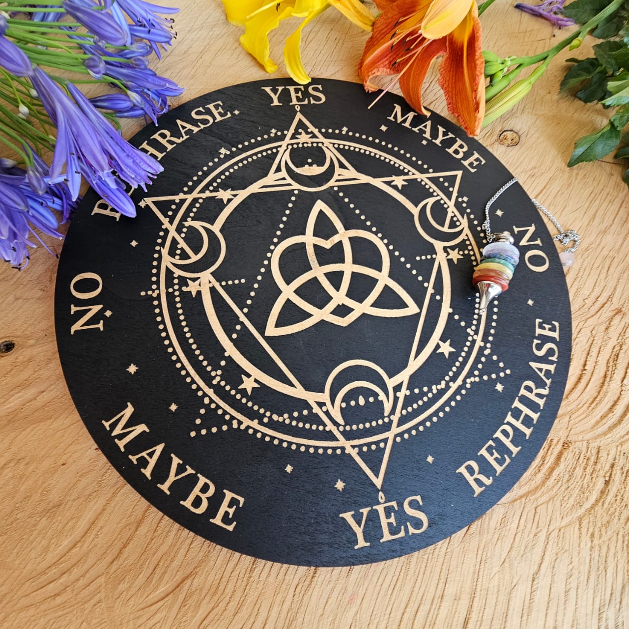 This dowsing divination board is inlayed with sarced geometry patterns and is made of wood.