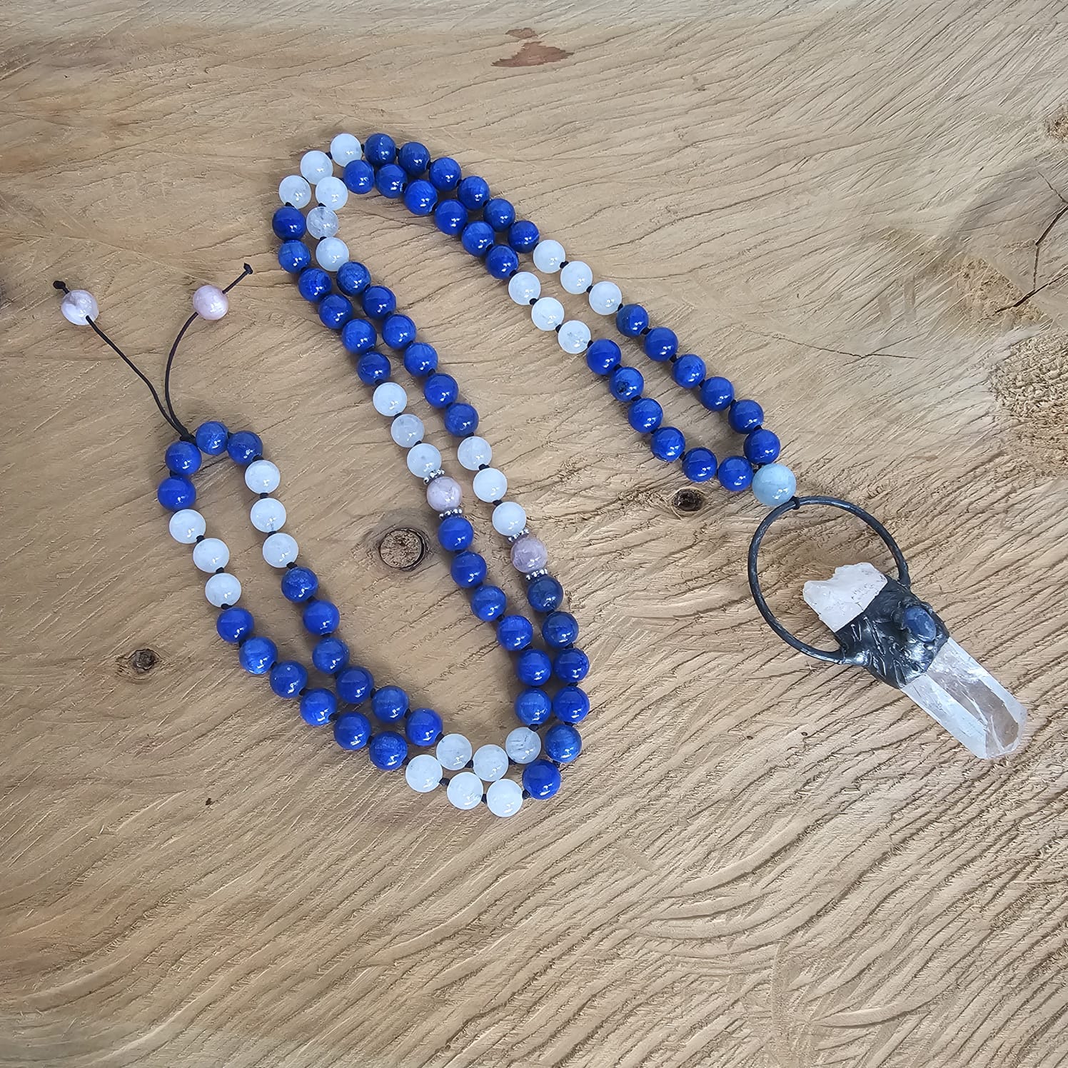 The Clarity & Truth Mala blends the deep wisdom of Sodalite with the amplifying energy of Clear Quartz, creating a powerful conduit for insight, communication, and mental clarity.