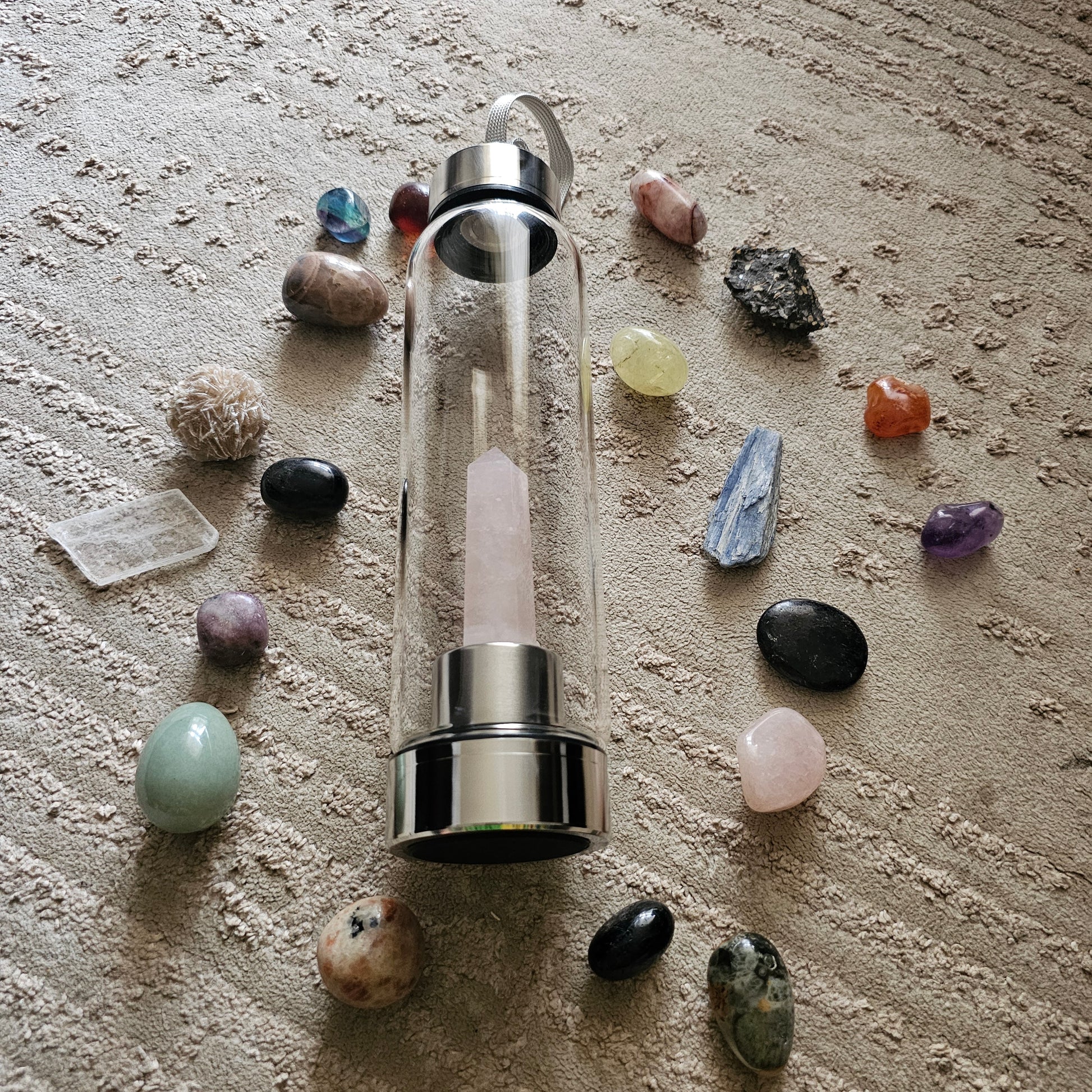 Our glass water bottle contains 100% pure, genuine crystal. Fill it up with water to create your own crystal elixir.