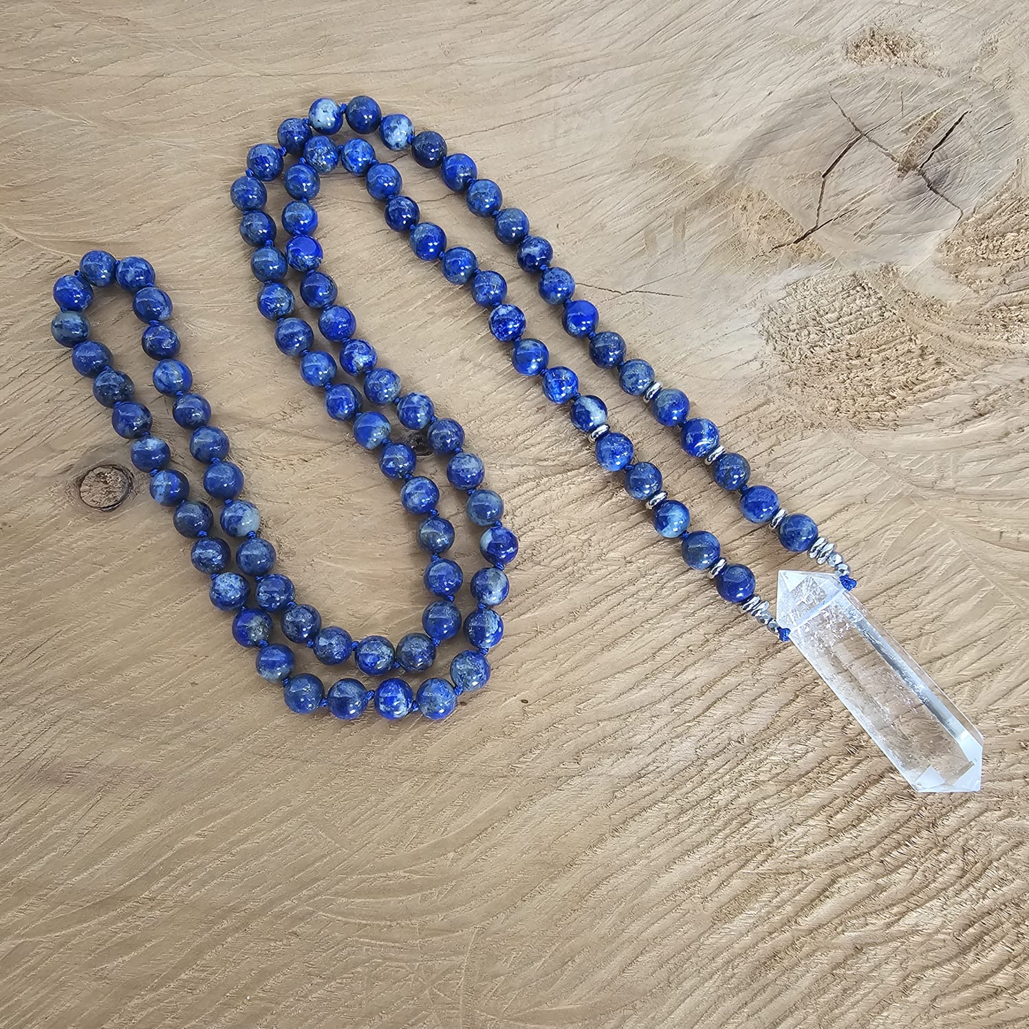 A fusion of wisdom, clarity, and divine connection, the Celestial Truth Mala combines Lapis Lazuli with a powerful Clear Quartz point as the guru bead—unlocking higher insight and spiritual mastery.