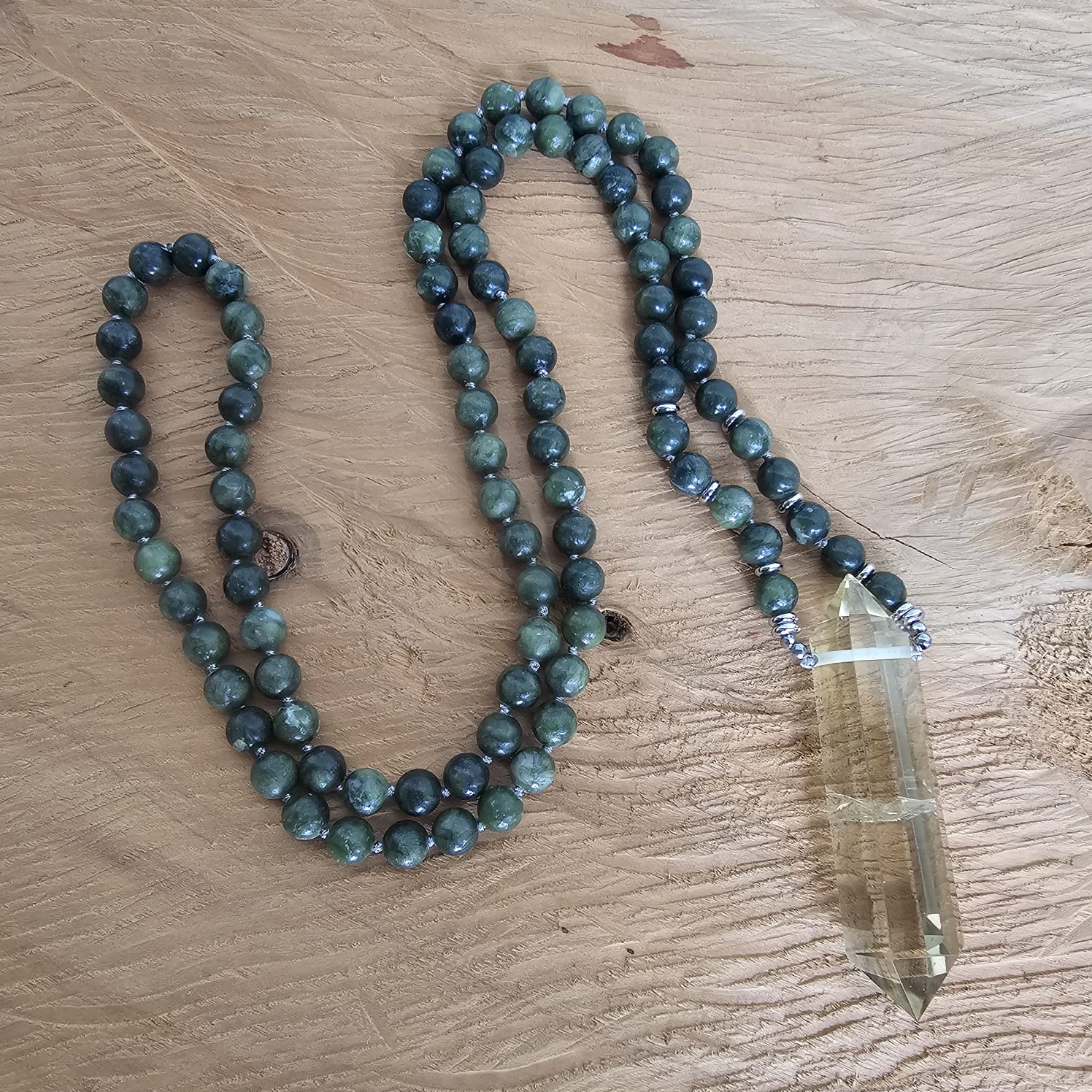 Infused with the energies of abundance, wisdom, and radiant confidence, the Prosperity Beacon Mala combines Green Jade with a powerful Citrine point as the guru bead—aligning luck, vitality, and personal empowerment.